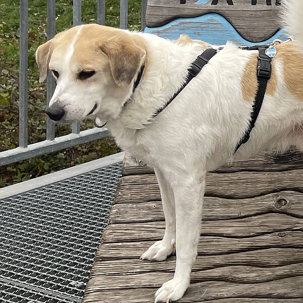 „Filipo ist eher ängstlich und braucht ein wenig Zeit, um sich auf fremde Personen einzulassen. Wenn er Vertrauen gefasst hat, ist er sehr anhänglich und braucht viele Streicheleinheiten. Futter ist seine große Leidenschaft. Er hat eine Hausstaubmilben- und Futtermilbenallergie und bekommt gegen den Juckreiz ein Medikament. Filipo ist ebenfalls verträglich mit anderen Hunden und Kindern.
