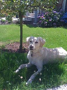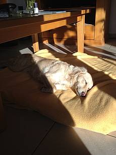 Optisch habe ich mich etwas verändert, denn ich habe ENDLICH gut zugenommen und mein Fell ist ganz lockig geworden ! Vielleicht hieß ich deßwegen als Welpe Curly :-) Aber bei dem warmen Wetter befreit meine Mama mich zum Glück davon, damit ich rennen kann wie ein Flitzebogen, bis jetzt war nur ein Hund schneller als ich :-)