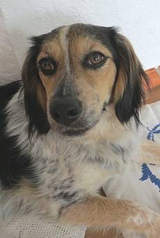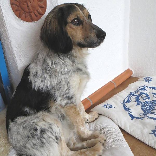 Dolly ist eine sehr liebe, anhängliche Hündin. Sie genießt das schöne Familienleben mit den anderen Hunden und auch mit unsere Katze hat sie keinerlei Probleme, im Gegenteil, sie freut sich, wenn Maja noch etwas Katzenfutter im Schüsserl lässt. Dolly kann es kaum erwarten auf’s Fensterbrett zu springen und das Schüsserl auszulecken. Wenn ich dann in die Küche komm und sie schimpfe, springt sie schuldbewusst schnell runter. D.h., Dolly muss mit liebevoller Konsequenz das Hundeeinmaleins noch lernen. Dolly geht gut an der Leine, aber viel lieber läuft sie frei. Sie tobt und spielt mit anderen Hunden und bleibt dabei aber stets in meiner Nähe. Vor Männern hat sie einen großen Respekt, wenn uns einer begegnet, verzieht sie sich in’s Feld und kommt -wenn die Gefahr vorüber ist- wieder raus. Mit etwas Geduld und sehr viel Ruhe nimmt sie schon mal ein Leckerlie von einem Mann entgegen, aber gleich danach hält sie wieder einen gesunden Sicherheitsabstand. Dolly ist ein ruhiges, dankbares Hundemädchen, das sich am Liebsten in meiner Nähe aufhält. Ab und zu klettert sie über den Zaun und erkundet die nahe Nachbarschaft, aber sie kommt ganz schnell zurück und ist glücklich wieder da zu sein. Dolly ist einfach ein toller Hund, den man liebhaben muss; sie hat eine angenehme Größe und ist sehr hübsch (Permanentmakeup).