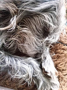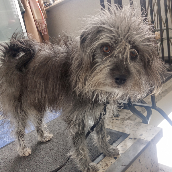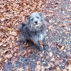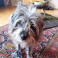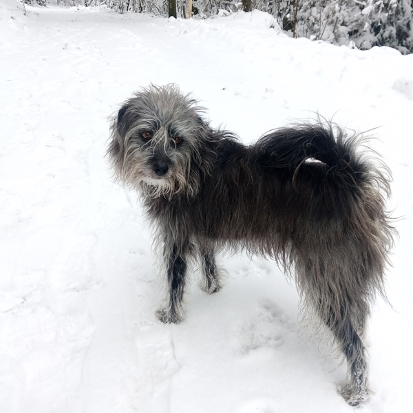 „Felix ist ein kleiner, ca. 35 cm hoher Mischlingsrüde. Er war in seinem ersten Lebensjahr in Griechenland komplett und alleine auf einem kleinen Balkon gehalten worden, wo er zudem nur unzureichend ernährt wurde. Als er zu mir kam, war er abgemagert und hatte kaum Fell. Inzwischen ist er ca. 3 Jahre alt, in seiner vollen Kraft und Lebensfreude.