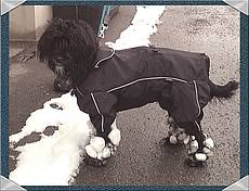 Für den Regen bekam er einen Regenanzug - damit sich das Oberfell nicht so vollsaugte und der nasse Hund nicht so sehr frieren muss.