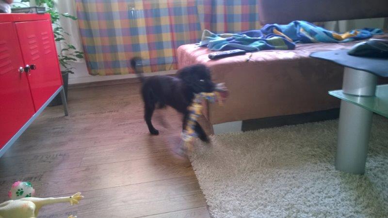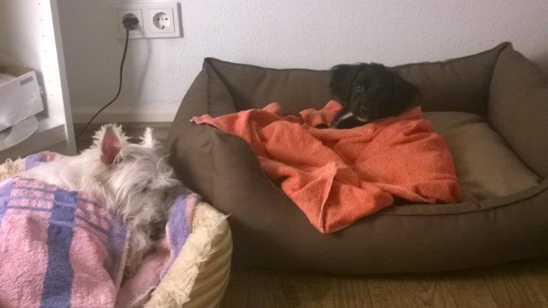 Der Kleine macht sich wirklich prächtig und missen möchte ich ihn auf keinen Fall mehr. Westie Dame Mausi musste sich manchmal ganz schön durchsetzen, denn Hugo möchte natürlich Chef werden ;). Zwischenzeitlich kennt er aber seine Grenzen und Mausi weiß was sie tun muss, damit er Ruhe gibt ;). Stubenrein ist er nun schon ein ganzes Weilchen und an unseren Rythmus hat er sich super gewöhnt. Bei den regelmäßigen Rheinrunden darf er immernoch komplett ohne Leine laufen, nur das Anleinen mussten wir mit Leckerlies üben. Alles in Allem läuft es wirklich super und wir sind wahnsinnig glücklich ihn hier zu haben ;).