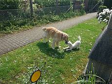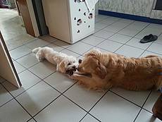 Dann gibt es noch Krümel, ein golden retriver, mit der spiele ich Tauziehen. Krümel ist viel größer und stärker, aber sie lässt mich immer gewinnen.