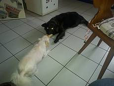 Mit Lou kann ich den ganzen Tag spielen. Wir spielen fangen oder er zieht an einem Ende und ich am anderen Ende. Manchmal spielen wir auch Katzen jagen. Meine Menschenfrau ist da nicht so begeistert von. Naja sie weiß es halt nicht anders und sie weiß auch nicht genau was so richtig viel Spaß macht. Obwohl Lou auch nur drei Beine hat, rennt er mit mir um die Wette. Ich schicke mal ein paar Bilder von mir und Lou.