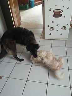 Als meine großen Menschen dann mal weggefahren sind kamen sie mit so was kleinem wieder. Sie haben dieses Etwas am Straßenrand gefunden, es war verletzt und brauchte dringend Hilfe.---Und schon musste ich wieder einspringen. Ich bewachte dieses Etwas und passte auf sie auf, kein leichter Job, aber was soll`s? Meine Menschen nannten sie Palinka.