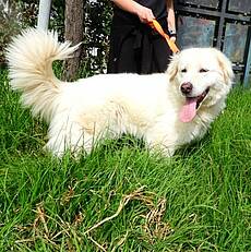 Sie nahm den zweiten Hund, einen Pudel mit und ließ Hug alleine im Garten des Hauses zurück. Ihre Tochter postete Hug im Facebook, um ihn zu vermitteln. Einmal täglich kam die Tochter zu dem Haus, um Hug wenigstens Futter und Wasser zu geben. Ansonsten war der hübsche Hundejunge ganz alleine in dem Garten. Hug konnte diese Situation des Alleineseins nicht aushalten, sprang über den Zaun und verschwand. Über Facebook wurde nach ihm gesucht und nach einer Woche fanden ihn die Tierschützer bei einem Bauern, der Hug bereits an die Kette gelegt hatte, damit er die Hühner bewacht. Die Tochter der früheren Besitzerin holte Hug bei dem Bauern ab, brachte ihn zurück zu dem Haus ihrer Mutter und sperrte den armen Kerl in das Haus ein, damit er nicht nochmal weglaufen kann. Hug, der immer noch nach seinem Frauchen sucht, leidet maßlos unter der Situation, da er ohne menschliche Zuwendung nicht leben kann.