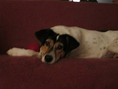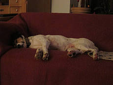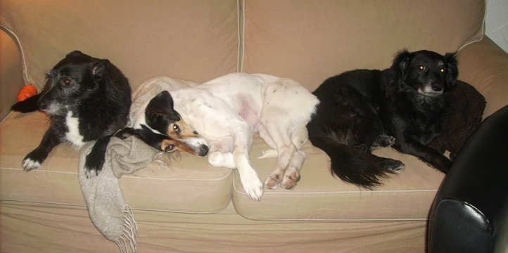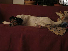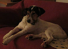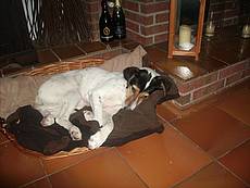 Kati ist super und uns gehts richtig gut mit ihr. Ihr Sofa ist ihr heilig, sie schläft nur darauf, egal wo wir sind, auch nachts! Und verarbeitet wild zuckend im Traum all die haufenweise neuen Eindrücke. 4 Hundekumpel hat sie schon kennen- und lieben gelernt. Und noch einen Riesen, den hat sie weggeknurrt und er hats akzeptiert - Kati stolz!