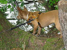 Margie ist ja nun schon zwei Wochen hier. Sie ist ein recht ruhiger Hund, in der Wohnung bemerkt man sie kaum. Sie könnte bestimmt gut mit ins Büro gehen, obwohl sie auch einige Stunden alleine bleiben kann. Ich könnte mir vorstellen, sie hätte Spaß am Agility, denn sie springt von alleine gerne auf Mäuerchen oder im Wald auch auf liegende Baumstämme. An der Leine gehen üben wir noch, sie hat manchmal schon ihre eigene Vorstellung davon wo sie hin möchte.