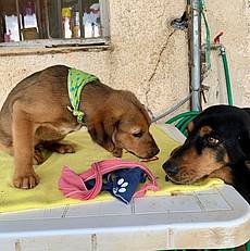 Die beiden Welpen suchen in einem Gebüsch Schutz vor Regen und Gewitter und winselten vor Angst. Glücklicherweise fanden die Tierschützer die beiden Kleinen und nahmen sie mit nach Hause. Nun leben die beiden Racker bis zu ihrer Ausreise Mitte Januar 2020 auf einer Pflegestelle mit mehreren anderen Hunden und Katzen. Wie alle Welpen sind auch diese beiden verspielt und benötigen viel Aufmerksamkeit und liebevolle, aber dennoch konsequente Erziehung. Da wir die Eltern nicht kennen, können wir zur ausgewachsenen Größe keine Angaben machen. Selbstverständlich sind beide Welpen geimpft, gechipt und entwurmt. Außerdem hat jeder seinen eigenen EU-Heimtierausweis im Gepäck.
