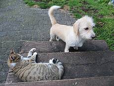 eigentlich heißte ich ja Bogi, aber mein neues Pflegefrauli findet, dass Mogli liebevoller klingt und dass das besser zu mir passt! Ja, ich bin nähmlich ganz ein Lieber, auch wenn’s gleich am Anfang gar nicht so ausgeschaut hat. Da bin ich ihr nämlich abgehaun, weil ich unbedingt beim alten Pflegefrauli bleiben wollte, und als sie mich dann ausgetrickst und eingefangen hat, da hab ich sie erst einmal sauber in den Finger gebissen und ganz fest angeknurrt und angebellt. Aber, weil sie mich schön in Ruhe gelassen hat und ich gesehen hab, wie lieb die zwei großen Hunde sie haben, hab ich auch gemerkt, dass sie es ganz schön gut mit mir meint und hab mich mal vorsichtig angenähert. Paar Tage hab ich mir schon Zeit gelassen, aber jetzt kann ich gar nicht mehr anders, jetzt freu ich mich, dass ich bei ihr sein darf. Die beiden Hunde und den kleinen Kater Timmi kann ich auch ganz gut leiden und das Gassi gehen macht großen Spass. Ich darf sogar frei laufen, aber wenn sie mich ruft, dann komm ich ganz schnell angeflitzt, nicht, dass sie mir auch wieder abhaut. Es wird mir sicher mal sehr schwer fallen von hier weg zu müssen, aber Frauli sagt, dass sie mich nur an ganz, ganz brave Leute vermittelt, die mich auch ganz lieb haben und die mich dann nie wieder hergeben wollen. Naja, dann muss ich das hald noch einmal mitmachen, hoffentlich sind die Neuen auch ein bissal geduldig mit mir und haben Verständnis, dass ich wieder paar Tage brauche – ich bin hald sehr anhänglich.