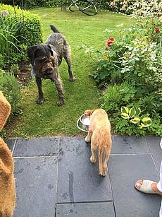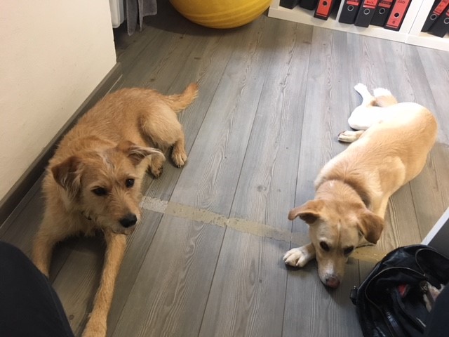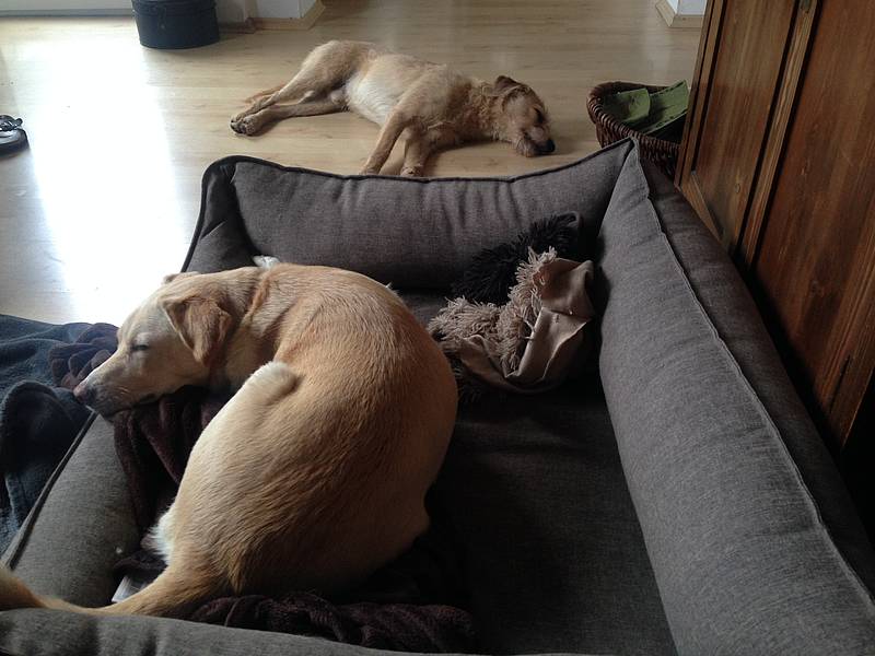 Übrigens hat Quinn hier im gleichen Ort eine dicke Freundin gefunden. Die, ebenfalls von Ihnen vermittelte, Finny (ehemals "Nelly") besucht uns fast jeden Tag morgens im Büro auf ein paar Leckerli. Und bei uns zuhause wird sich sogar Quinns Körbchen geteilt. In der Anlage ein paar Impressionen für Sie.