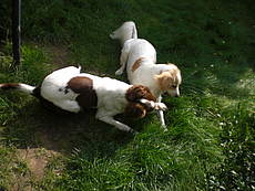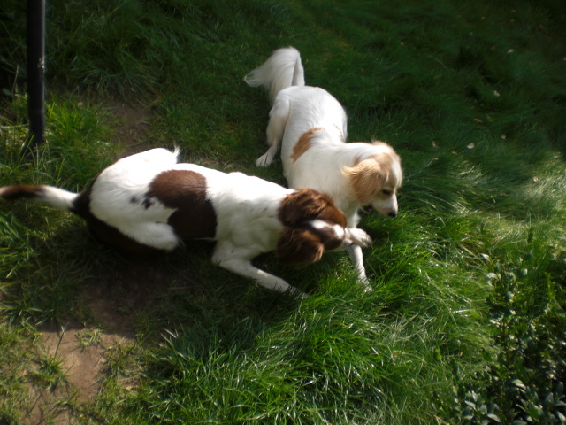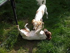 Sie liegt gerne mit den Kindern auf der Couch und schmust oder spielt, läßt man die Hunde alleine, legt sie sich auf der Couch schlafen und sie wächst wohl mit unserer kleinen Hündin zu einem Dream-Team zusammen. Die beiden laufen bei Spaziergängen nebeneinander, gucken abends gemeinsam bei Spaziergängen den Kaninchen hinterher, spielen zwischendurch (sofern es die doppelte Leinensicherung zuläßt),  toben wie die Wilden durch den Garten (das ist so schön anzusehen, wieviel Spaß die Beiden haben) und liegen im Haus oft zusammen und es gibt auch schon mal ein kleines Küsschen. Stofftiere schleppt sie auch schon gerne durchs Wohnzimmer. Gegenüber anderen Hunden beim Spazierengehen ist sie sehr verträglich. Bei Spaziergängen sind auch viele von diesem Dream-Team ganz angetan.